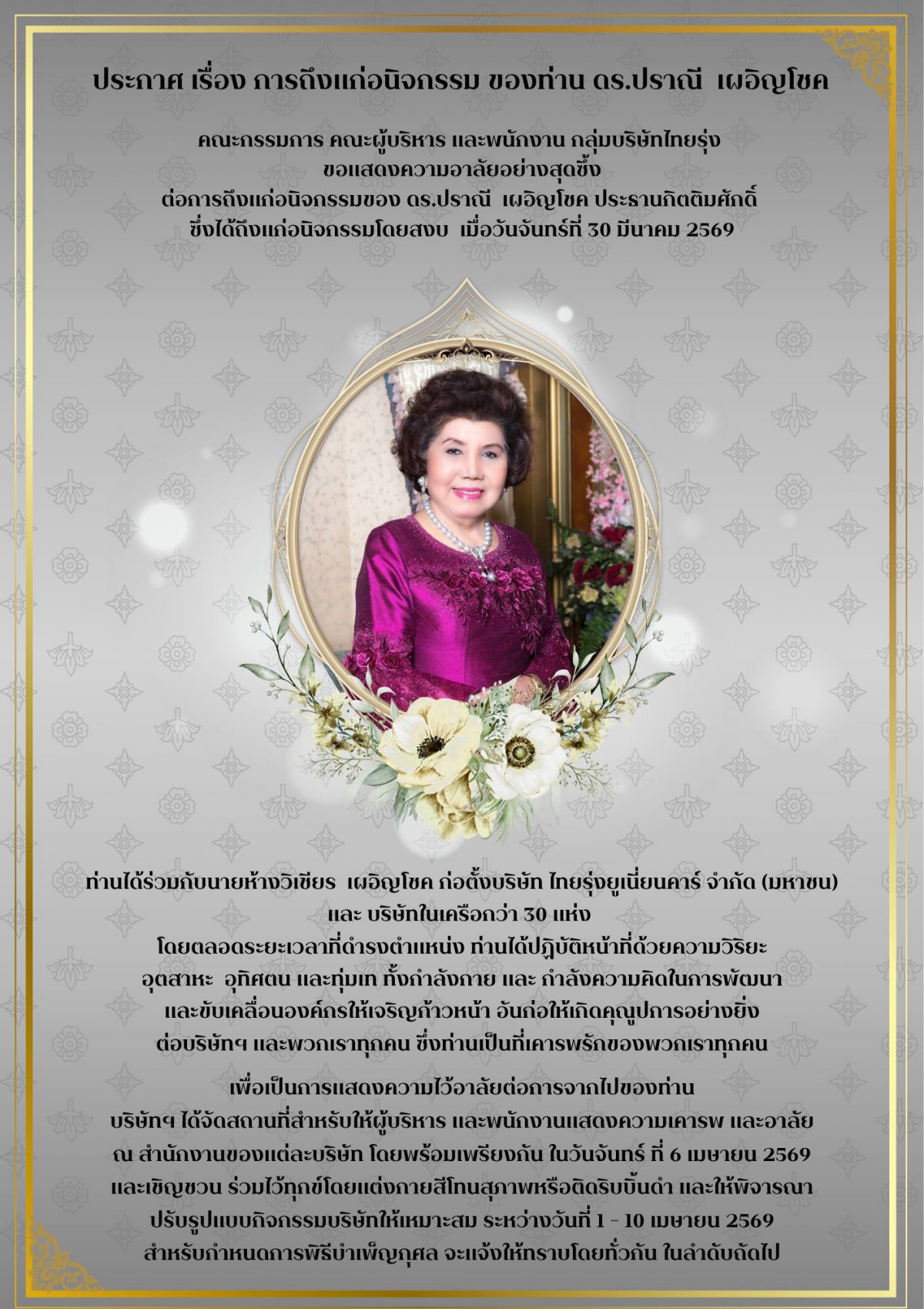 กลุ่มบริษัทไทยรุ่ง ขอเชิญผู้บริหารและพนักงานทุกท่าน ร่วมแสดงความเคารพและไว้อาลัย ระหว่างวันที่ 1–10 เมษายน 2569